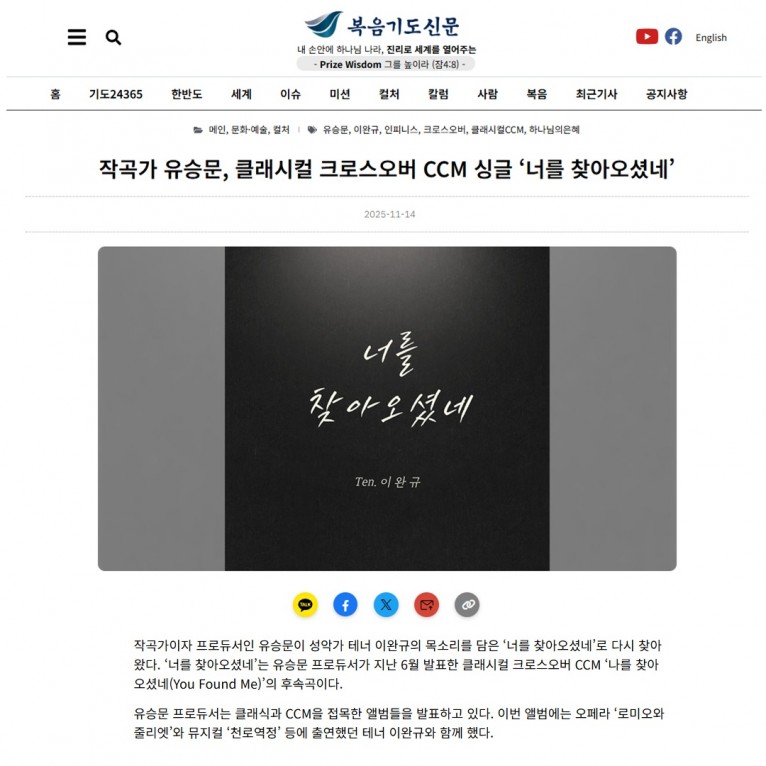 뮤직타임 [기사] 작곡가 유승문, 클래시컬 크로스오버 CCM 싱글 ‘너를 찾아오셨네’(복음기도신문)