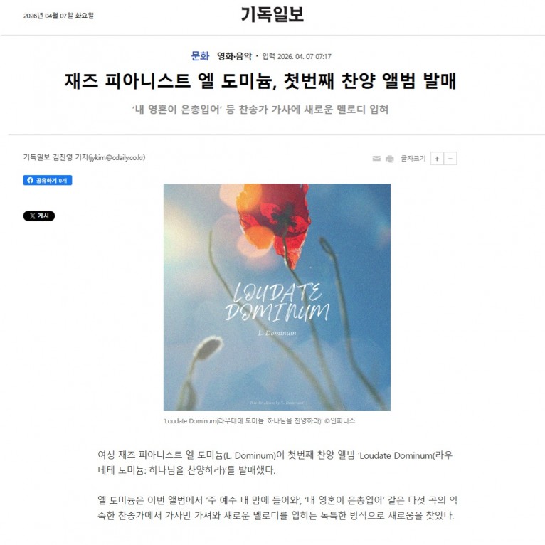 여성 재즈 피아니스트 엘 도미늄(L. Dominum)이 첫번째 찬양 앨범 ‘Loudate Dominum(라우데테 도미늄: 하나님을 찬양하라)’를 발매했다.